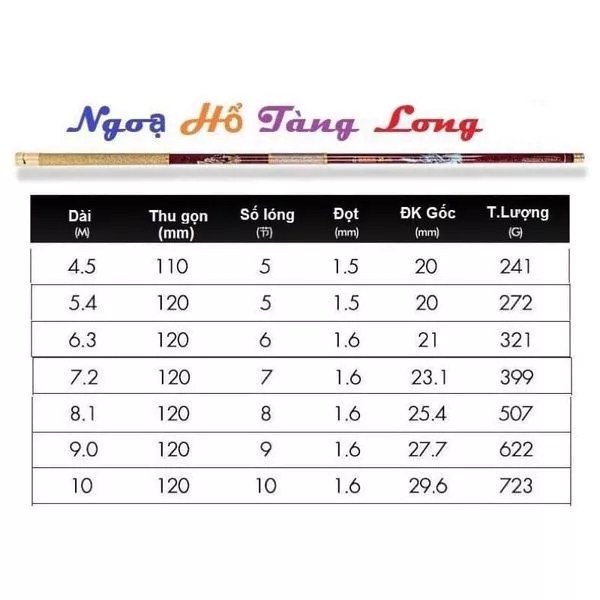 Các loại size: Độ dài cần 3m6,4m5, 5m4,6m3, 7m2